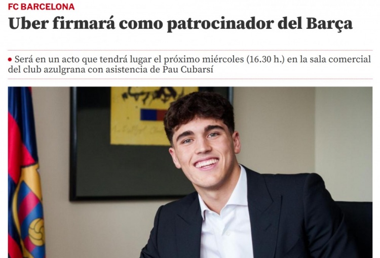 Phương tiện truyền thông phương Tây "World Sports News" đưa tin rằng Câu lạc bộ Barcelona sẽ ký thỏa thuận tài trợ với Uber. Sự kiện sẽ được tổ chức lúc 16:30 giờ địa phương vào thứ Tư tới tại Hội trường Thương mại của Câu lạc bộ Barcelona.